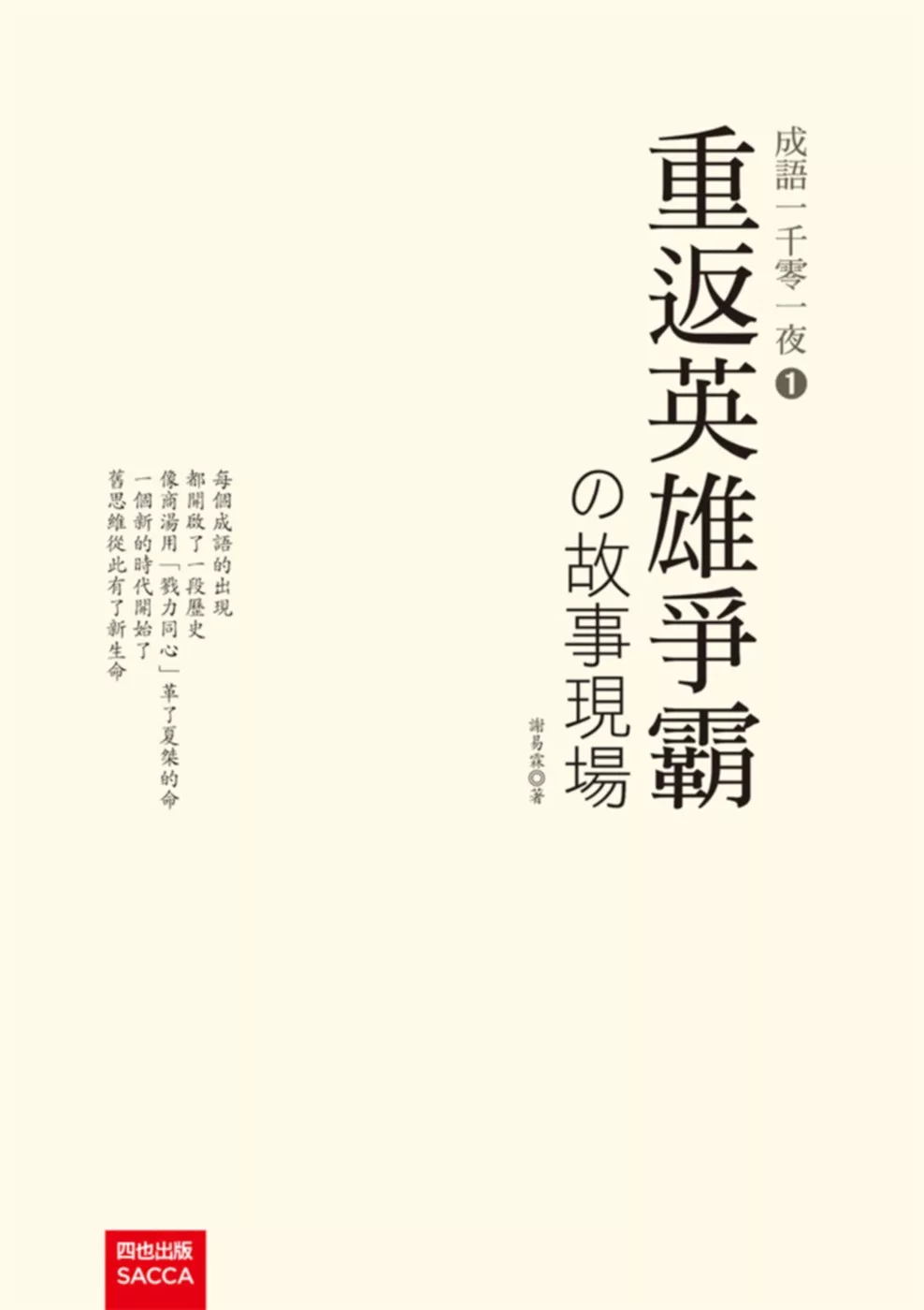 字典的成語解說,或市面上所見成語故事,大部分都太老套,不容易吸引閱聽人的興趣,謝易霖老師有鑑於此,特別編寫了這本生動有趣的成語故事《成語一千零一夜1──重返英雄爭霸的故事現場》。昔人有云,沒有故事,沒有歷史,謝易霖老師這本書,每一頁,每一段,都是精采的故事。