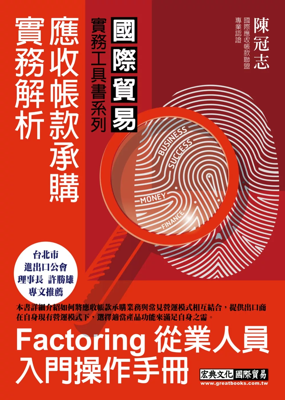 本書總策劃- 台北進出口商業同業公會有鑑於國際貿易以放帳為交易條件的比例,目前已為大宗,且近期兩岸貿易趨勢快速加溫,訂單以放帳為交易要求大量來自對岸,台灣出口商如何面對因放帳交易而面臨風險和資金的雙重挑戰,尤其是設廠於大陸之台商,在目前物流、金流模式受限的情況下,如何以適當的金融產品操作,來提升本身接單出貨的能力,並同時規避不必要的倒帳及匯兌風險,應是台灣出口商最關切的議題。本公會經市場調查瞭解,「應收帳款承購」業務,雖已在歐美及兩岸廣為出口商所運用,做為解決因放帳交易所帶來的各項問題;然而,台灣坊間卻無任何有關介紹本項金融產品實務操作的書籍,因此,本公會著眼於出口商的實際需求、Factoring 業務的實務操作,特別是針對不同的放帳交易模式以案例說明來規劃本書,提供業者及金融機構運用操作本項產品之參考。