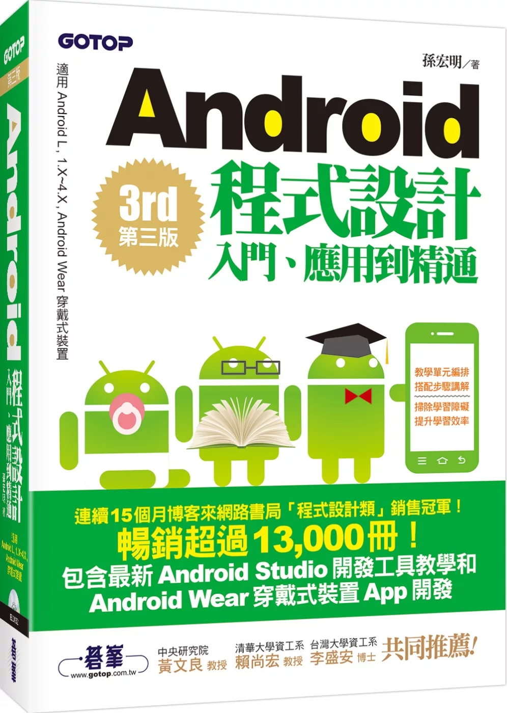 『推薦大家這本由孫老師精心編寫的Android教學書籍,其中包含許多重要主題單元,內容非常豐富,討論了非常多的例子。這是一本非常好的學習手冊與工具書,非常適合已具備Java語言基礎,要學習Android程式開發的讀者。』--台灣大學資工系 李盛安 博士--