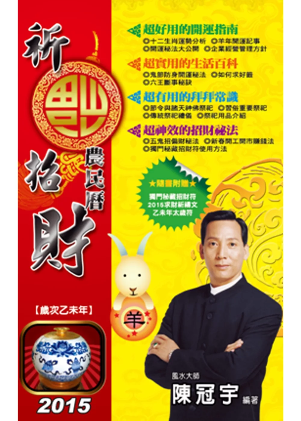 《祈福招財農民曆》是風水大師陳冠宇根據國人的風土民情、風俗習慣所彙編而成,內容豐富實用,參考價值高,完全符合國人的傳統禮俗與實際生活,是您一年三百六十五天都不可或缺的開運導師,也是您求財納福絕對不可少的最佳指南!