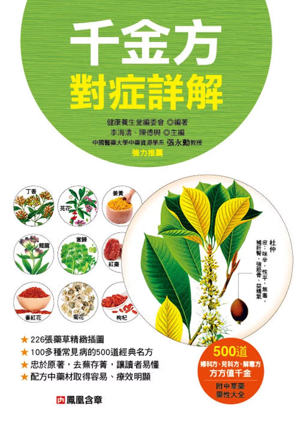 本書作者南京中醫藥大學李海濤教授等二十七位作者群,將此巨著以通俗之白話文,配合簡明易懂之彩色圖解形式,刪除原書艱澀難懂及目前少用之處方及藥物,全書內容除介紹中醫藥基本常識外,依中醫疾病科別分類介紹,並附上藥方中具代表性之藥用植物彩圖、藥材形態特徵、功效說明、性味歸經、功能主治、產地、產期等,每章節後並收錄該科常用中藥材圖譜,提供更完整的參考比對資料,使讀者能以較簡易之方式應用《千金方》及購買正確藥材,以達到保健養生之目的。