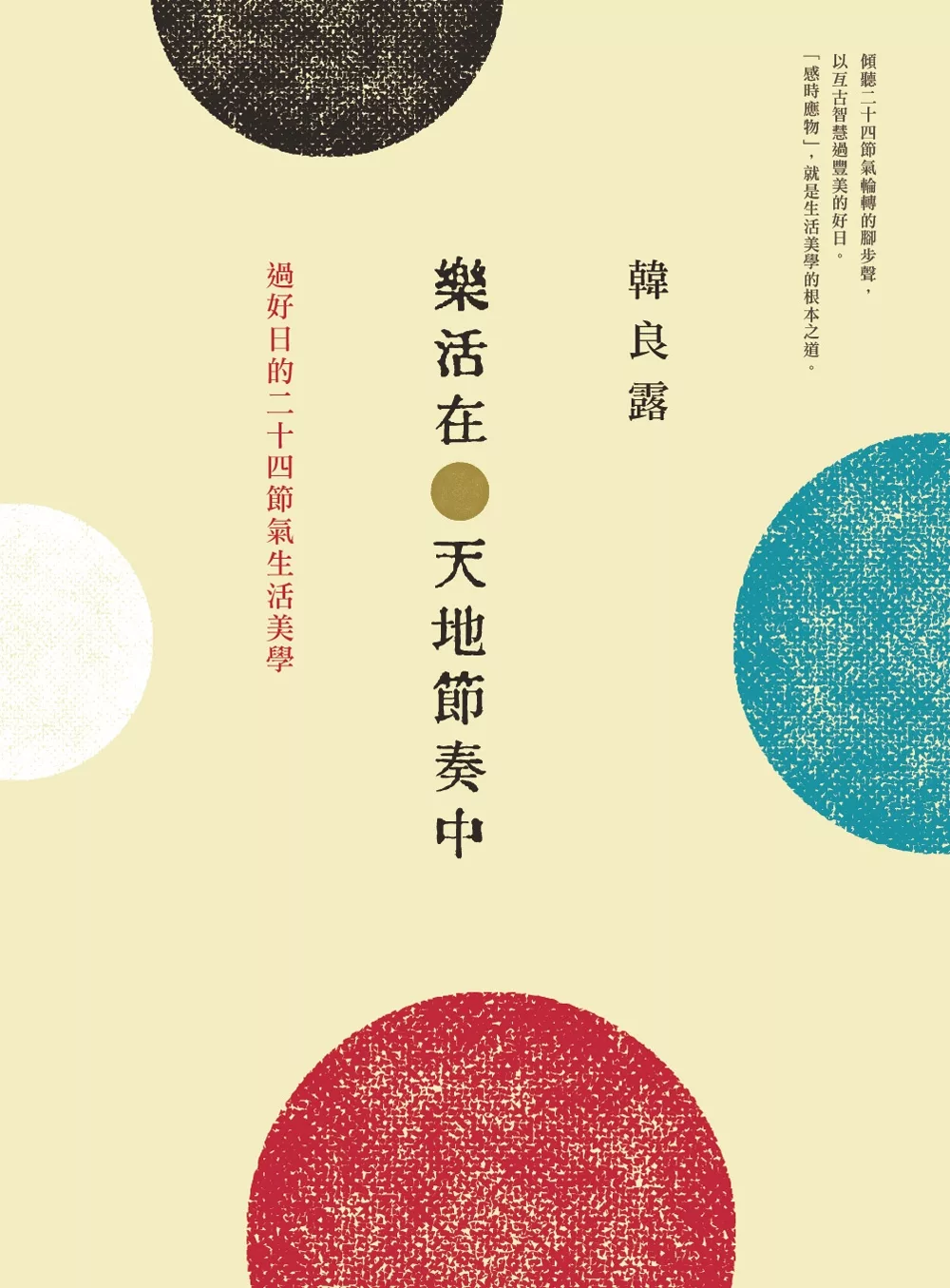 《樂活在天地節奏中:過好日的二十四節氣生活美學》,對我是一本極為特別的書,這本書與其說是寫出來的,不如說是活出來的,書中聚集我雜學數十年的知識熱情,也有不少我深信學而不思則罔的獨立思考與領悟,更有我在日常生活中的觀察與實踐,尤其過去七年我從事南村落文化活動,我自己成為最大的受益人,讓我能接地氣般深入台灣的民俗生活,我很感激這套深入華夏文明的二十四節氣曆法,讓我可以生活得如此豐美,我期望能和大眾一起分享豐潤的生活,更期望如此豐厚的華夏文明傳統能夠復興燦爛!