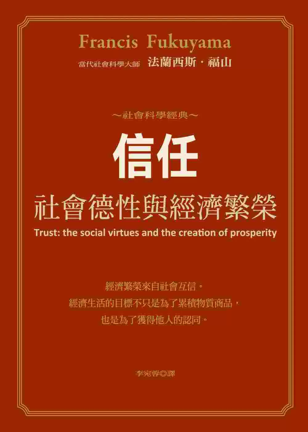我希望中文版《誠信》能幫助讀者更清楚了解到文化對經濟發展的真正重要性,西方經濟革家向來嚴重忽略我們經濟生活中的文化因素,原因是文化因素無法吻合經濟學界所發展出來的通用成長模式,然而只要做過跨文化生意的人都知道,文化因素的重要性無庸且疑,膽敢忽略文化因素的生意人唯有失敗一途。