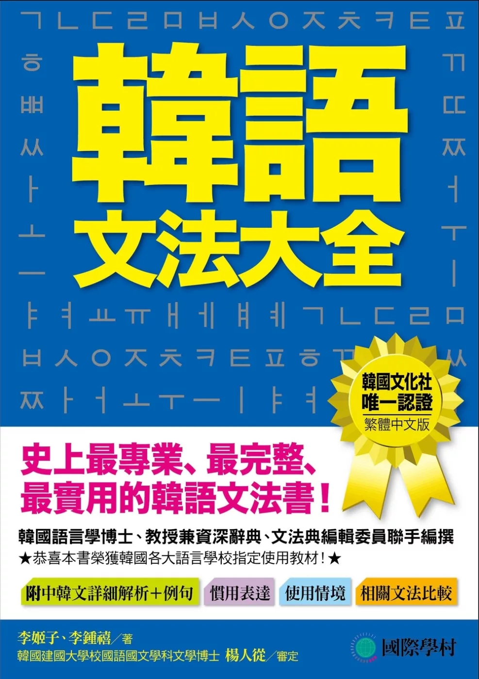『韓語文法大全』由兩位韓國資深教授共同著作,中文版獨家再聘請韓語博士楊人從教授進行審定,專業度100%!書中收錄初級到中級、高級的所有韓語文法,搭配中文、韓文雙向解釋,符合各種程度的需求,從初學者到韓語教師都適用!
